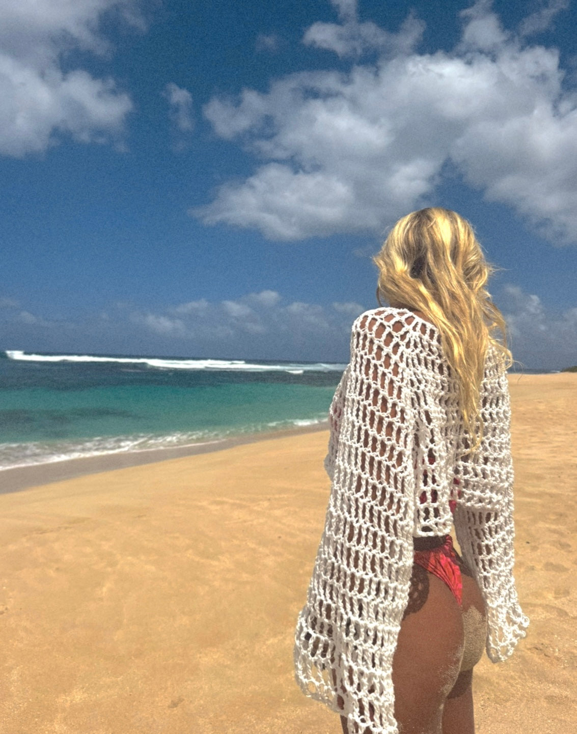 white crochet longsleeve top with flared sleeves. elevate any outfit by layering with these details. perfect beach top. size small/medium.