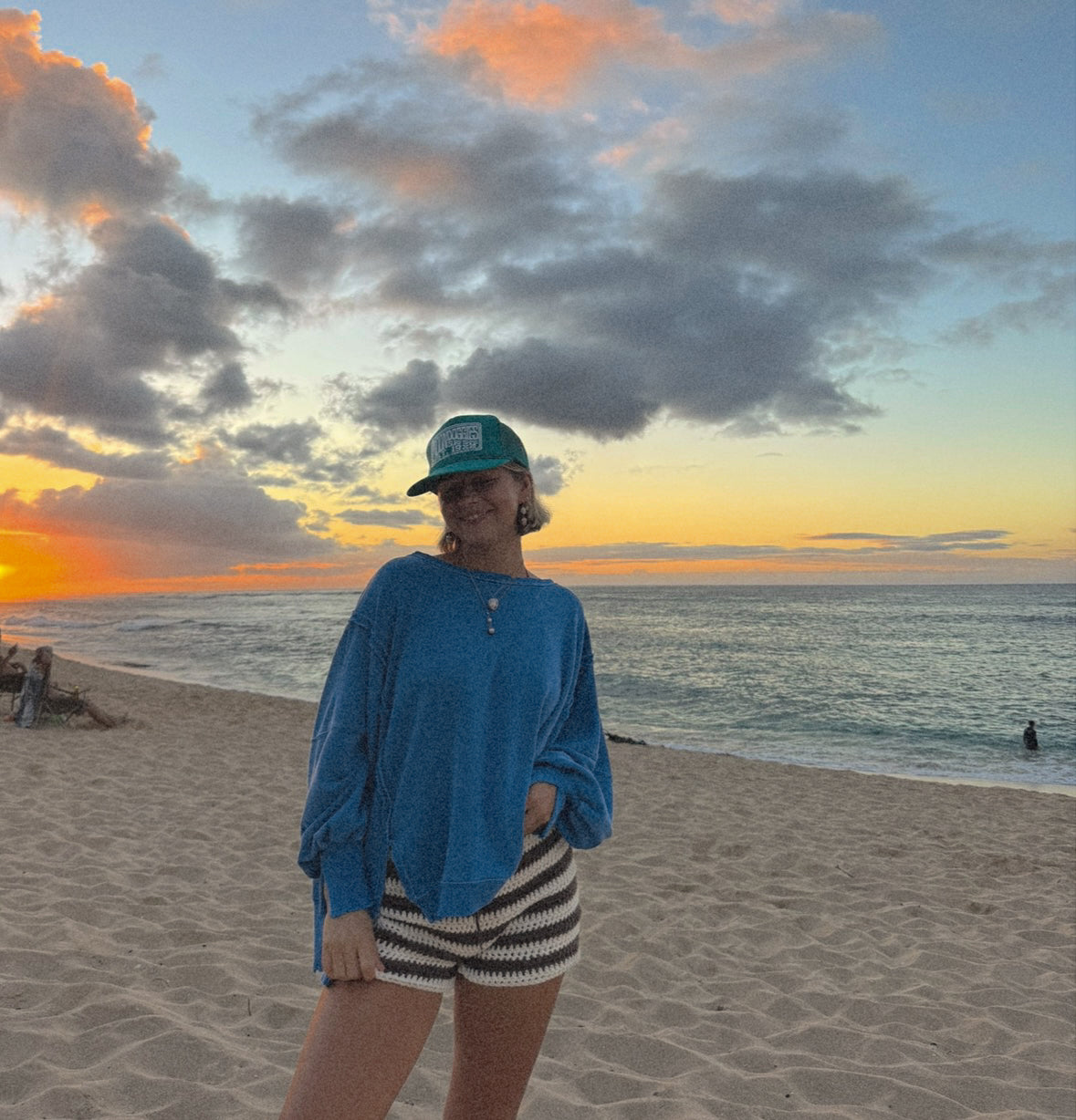 crochet brown and white striped shorts with adjustable tie waistband. the comfiest lounge at home shorts & also perfectly paired with a bikini for the beach. size medium. model is 5'8 and 150lbs & usually wears a size 6.